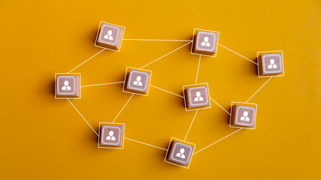 This image showcases a creative representation of social connections using wooden blocks and abstract avatars against a vibrant yellow and blue background, symbolizing networks.