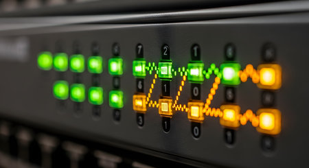 Close-up of a network switch with red and yellow lights.