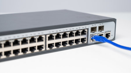 A close-up view of a network hub, with cables connecting and transmitting data, showcasing the intricate network infrastructure within a modern data center.