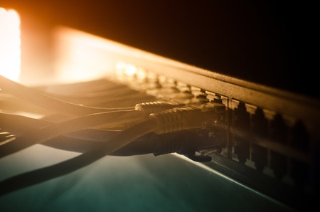 Network switch and ethernet cables, symbol of global communications. Colored network cables on dark background with lights and smoke. Selective focus. Network internet concept background