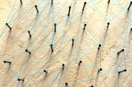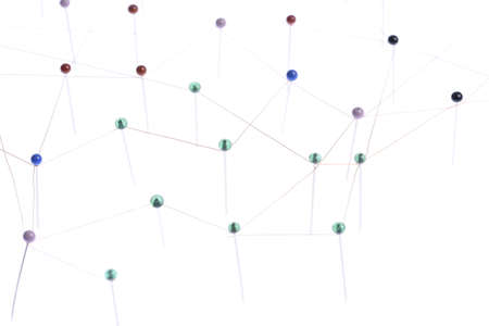 abstract web line connection of color yarn from nail node to node on white background , networking concept.