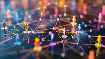 Colorful network connections represented by vibrant dots and lines illustrating collaboration and communication in a digital environment