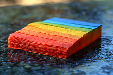 Vibrant, stacked tissue paper sheets arranged in rainbow colors sit on a reflective, wet surface. ideal for crafting, decoration projects, and creative design purposes. perfect for colorful backgrounds, diy projects, parties, and festive decorations. Generative AI