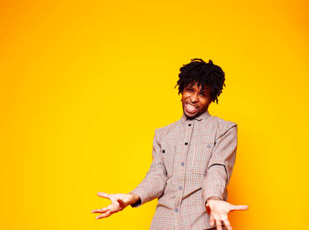 young handsome african american guy student posing cheerful and gesturing on yellow background, lifestyle people concept
