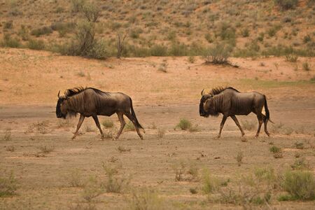 Two Blue Wildebeests (Connochaetes taurinus) walking together in Kalahari desert on red sand. Dry desert and morning sun.
