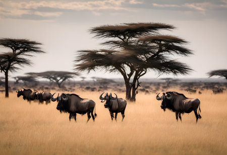 This captivating photo depicts a herd of wildebeest moving across the savannah during a warm sunset, highlighting the harmonious relationship between wildlife and nature.