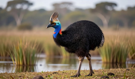 A vibrant cassowary walks gracefully near calm waters, surrounded by lush greenery and tall grasses. The early morning light enhances the rich colors of its stunning plumage.