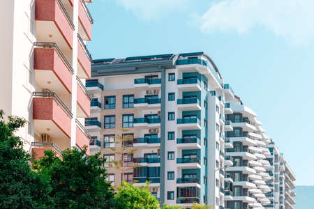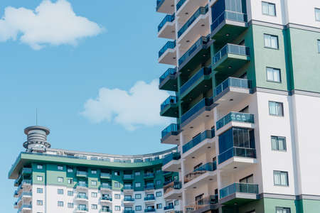 Fragment of modern luxury residential apartment, home house building concept. Modern apartment building on a sunny day with a blue sky.
