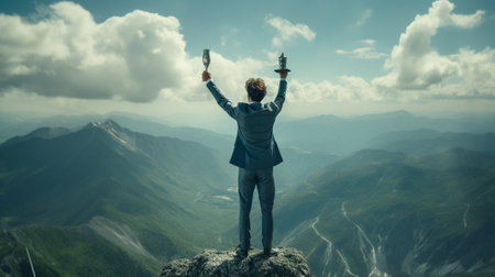 Businessman standing holding cup on top of mountain. achievement concept. Generative AI