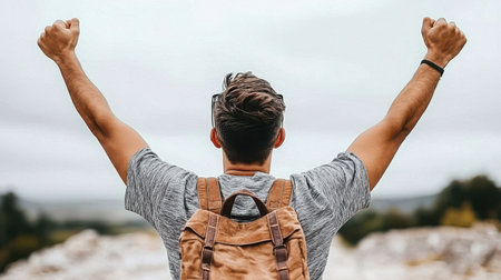 A young man stands against a beautiful landscape, arms raised in celebration of success, embodying joy and freedom amidst nature.