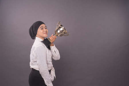 Happy young female intrepreneur or business woman holding his gold trophy and celebrating her victory.Studio shot.