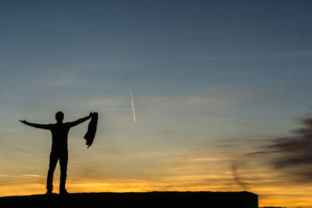Silhouette man raising up hands on mountain on Gran Canaria island.