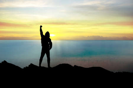 silhouette of man show arm up for achievements successful and celebrating success with sunrise