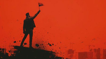 A striking silhouette of a person standing atop a mountain peak, raising a flag against a stunning golden sunset. This image evokes feelings of achievement and adventure.