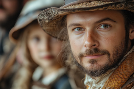 A man dressed in 17th-century clothing stares intently at the camera while wearing a black hat with a metal band