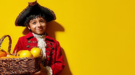 A young child dressed in a vibrant historical costume smiles joyfully while holding a basket filled with fresh fruits, capturing the essence of childhood happiness.
