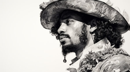 gil walker, the king of pop, is captured in this studio portrait wearing a hat and headwear. the intricate black and white illustrations add a touch of artistic flair to the image. inspired by the san francisco renaissance, the portrait showcases photorealistic detail and incorporates afro-colombian themes. with a hint of floralpunk, gil walker's dreamy and captivating presence shines through in this stunning portrait. ai