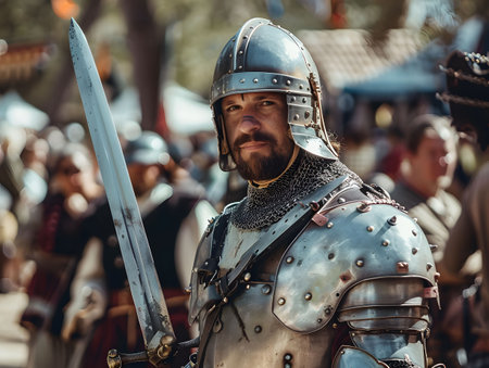 A musketeer raises his sword in salute to an enthusiastic crowd during a vibrant historic celebration. The plume on his hat billows as the audience cheers, creating an atmosphere of excitement.