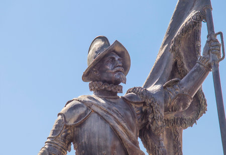 Villanueva de la Serena, Spain - April 4th, 2021: Pedro de Valdivia, Spanish conquistador. Sculpted by Gabino Amaya in 1987. Villanueva de la Serena, Badajoz