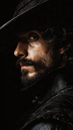A graceful musketeer dressed in period garb, displaying courage and gallantry in a captivating Renaissance environment