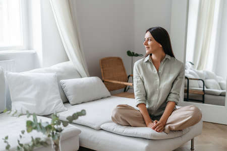 In cozy living room happy woman sitting in lotus position leaning on sofa, 30s european woman enjoying lazy weekend or vacation, relaxing housewife feeling satisfied, doing housework concept. photo