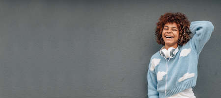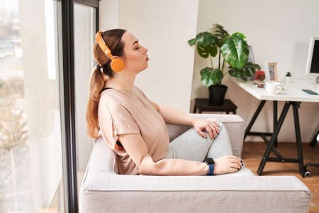 mixed race woman girl is sitting lying on couch at home with her eyes closed with headphones. teen student listens to music. person is resting