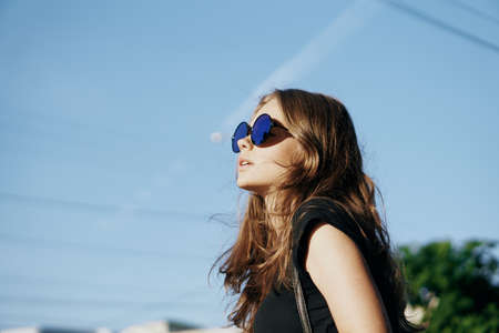 Young beautiful woman in sunglasses walking along a street in a city in the fresh air.