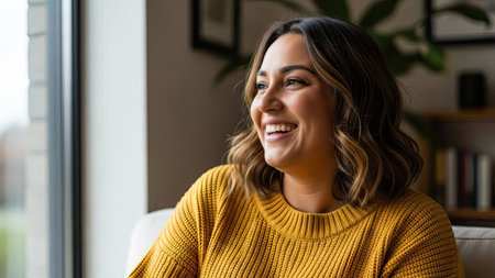 A woman is smiling indoors, near a window, lit by natural daylight. She wears a yellow sweater, showcasing a close-up portrait with a positive expression. The image employs soft focus and warm tones. Suitable for commercial applications, this image could be utilized for various editorial purposes.