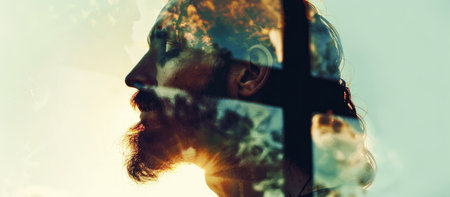 Jesus Christ Face Cross religion concept. Jesus Christ face on cross background.