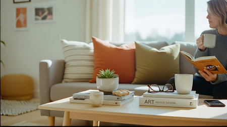 Living room interior with sofa, coffee table, books and vase