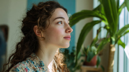 Woman with closed eyes enjoying peaceful meditation indoors, surrounded by natural light and greenery, embodying tranquility and mindfulness
