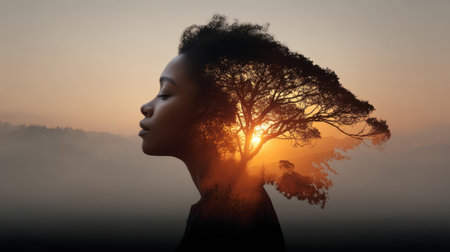 A serene silhouette of woman blended with sunrise and tree