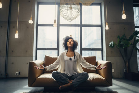 A serene woman meditating in a cozy room with natural light