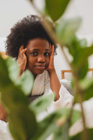 Black young woman wearing white shirt looking at camera while sitting in bed at home