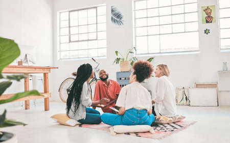 Happy, relaxed and talking business group laughing and bonding while working together in a modern office. Diverse designers brainstorming, sharing creative ideas or a team project strategy