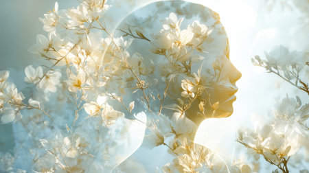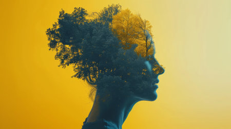 A conceptual double exposure image blending a human profile with lush green foliage, symbolizing a harmony between the mind and nature.
