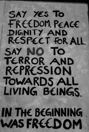 Horizontal photo of human rights signs with a red sign in the center, set against a vibrant green background, emphasizing human rights issues