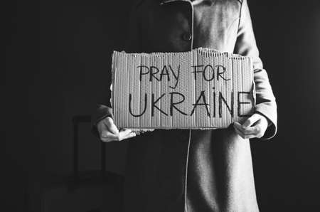 Ukrainian refugee holding placard with Pray for Ukraine text. Evacuation of civilians. Freedom to Ukraine concept.