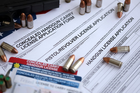 USA firearms license and handgun with bullets on US Constitution. Gun permit and Constitution second amendment concept