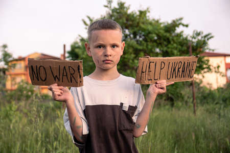 A boy with a grimy face and sad eyes holds a cardboard poster with the inscription NO WAR and HELP UKRAINE in English in his hands. A small boy of European appearance opposes military action.