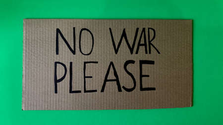 A cardboard plate with a black inscription requesting an end to the war. world peace