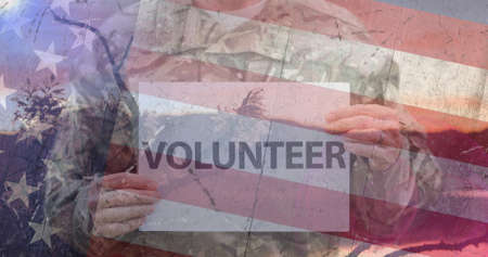 Composition of male soldier holding volunteer sign over american flag. patriotism and celebration concept digitally generated image.