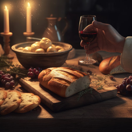 A serene still life featuring an open Bible, a fine wine glass filled with red liquid, and a piece of bread, all set on a beautifully lit table.