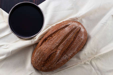 Chalice with red wine and rustic bread on linen fabric with wheat stalk.