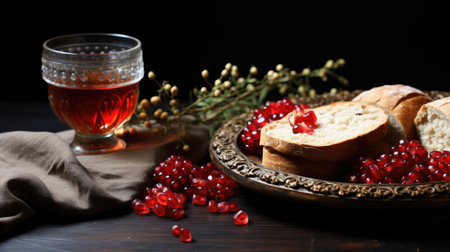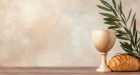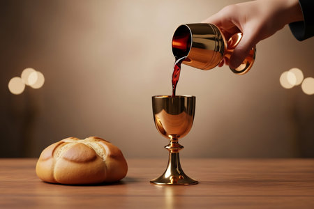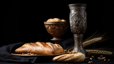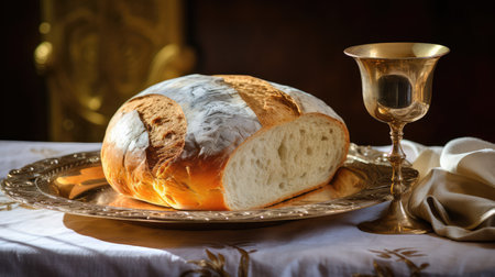 A golden cup and a piece of bread are placed on a table. The cup is filled with liquid, and the bread is placed next to it. Concept of celebration or a special occasion, as the cup