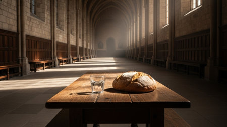 An environmental, cinematic wide shot capturing the stark simplicity of a Lenten fast. The focus is