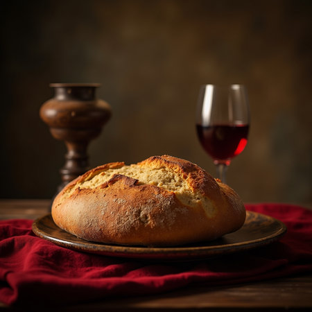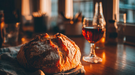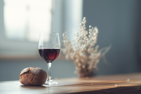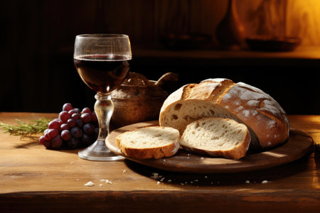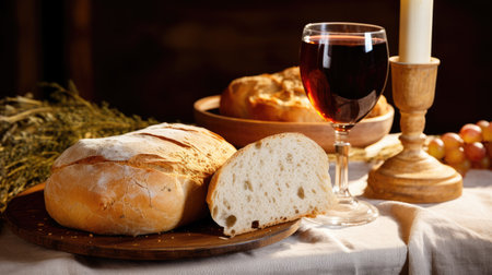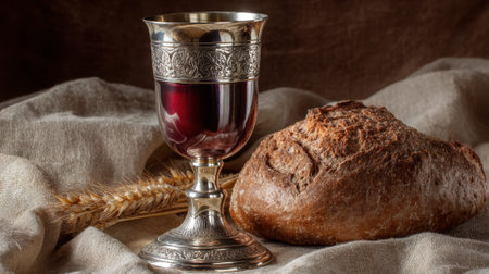 Rustic loaf of bread, partially torn, with a crumb on a wooden table. a clay chalice filled with red wine stands nearby. symbolic of communion, eucharist, and tradition.