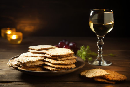 Jewish traditional matzah bread and red wine on a brown wooden table, Passover, Generative AI content