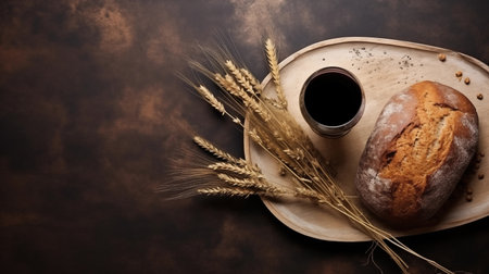 Eucharist symbols. Glass of wine, bread and wheat ears on brown background.