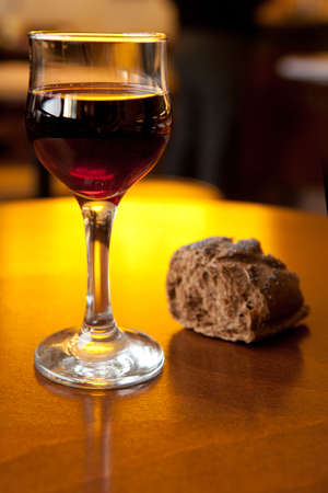 Taking holy communion at a wooden table in a church. Red wine and bread in the cup of a glass. Corpus Christi concept.